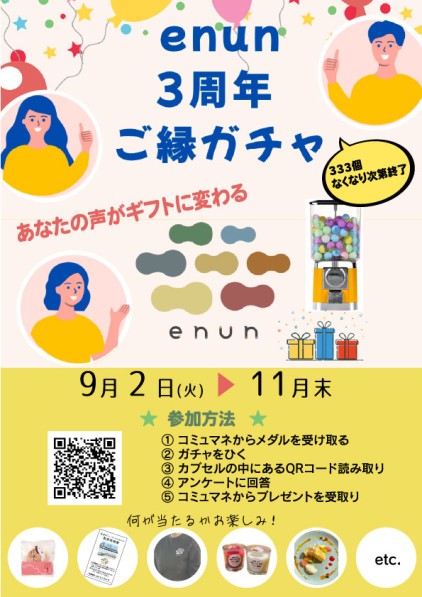 enunから生まれたエピソードや思い出、出来事などを是非 教えてください!3周年記念の各種企画やイベントもお楽しみに!